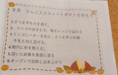 9月のおやつレクでは、秋の味覚をたっぷり使った**「りんご入りスイートポテト」**を作りました。