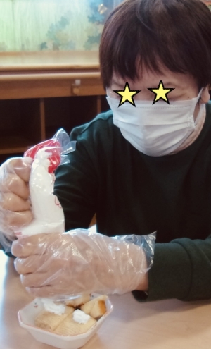 マロンクリームの絞り出し:モンブランの顔となるクリームを絞り袋に入れ、土台の上に丁寧に絞り出していただきました。クリームの固さや力加減を調整しながら行う作業は、握力や巧緻性の訓練になります。