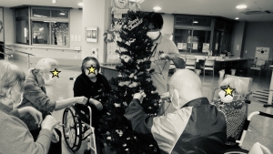 ツリーの完成を祝して、「きれいだね」「華やかになったね」と、皆様で記念撮影を楽しまれました。この輝くツリーは、年末のデイサービスのシンボルとして、皆様の活動を見守ってくれます。