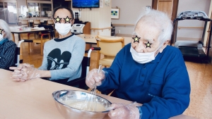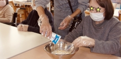 「美味しくなーれ!」と声を掛け合いながら、牛乳とホットケーキミックスを投入。粉っぽさがなくなるまで、皆様で交代しながらさっくりと混ぜ合わせました。ビニール手袋をしての作業も、皆様手慣れたものです!